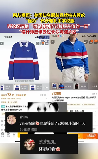 此前,有IP显示为美国的网友在社交平台晒出在知名品牌拉夫劳伦门店拍到的照片——照片中,一款长袖POLO衫与长沙市雅礼中学秋季校服在配色和设计上极其相似,引发网友热议:“不是拉夫劳伦买不起,而是雅礼校服更有性价比!”
