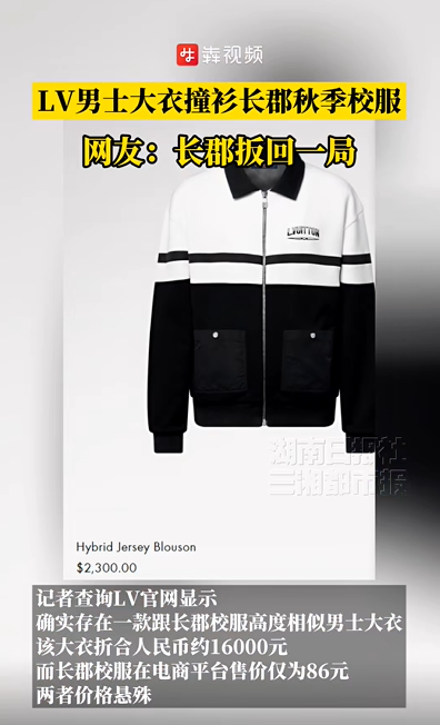 记者查询LV官网发现,在售商品中确实有一款与长郡校服高度相似男士大衣,配色和条纹位置都很相似,折合人民币约16000元,而长郡校服在电商平台售价仅为86元,两者价格悬殊。